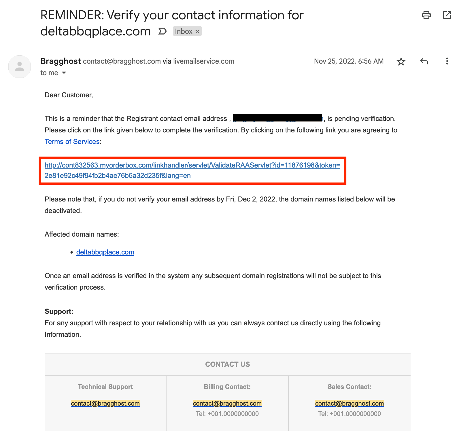 Failure to click this link WILL result in the registry placing it on HOLD, disabling it (meaning your website will go offline). If you do not see this email within 24 hours of registration, please check your Spam/Bulk email folder or reach out to our team to have it resent.