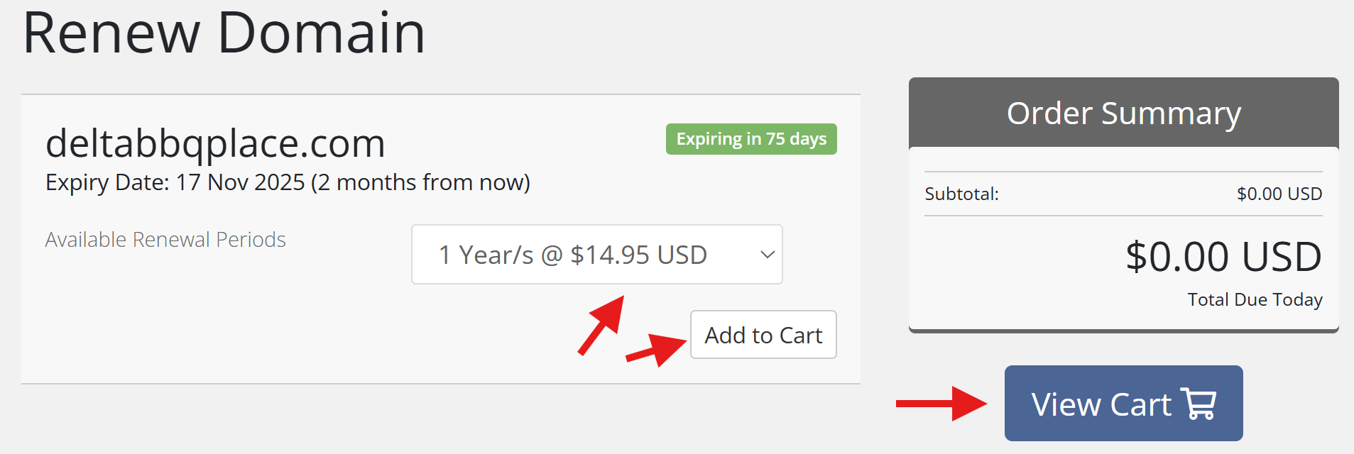 STEP 3: Select renewal term & complete checkout. On the Renew Domains page, locate your domain(s), choose your desired renewal length, add them to your cart, then proceed with checkout.