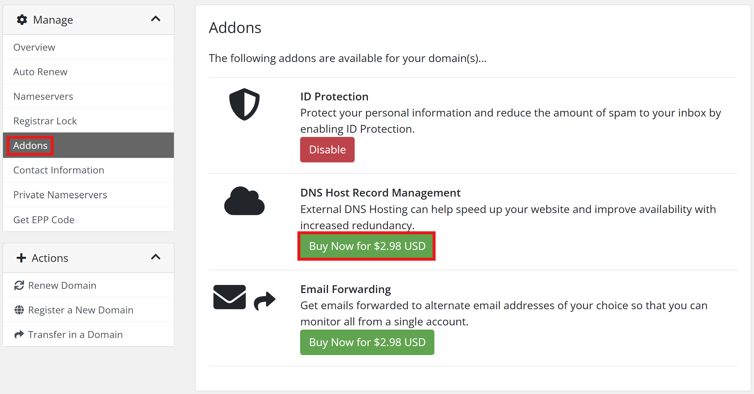 2) On this page, under the Manage menu on the left side of the screen, click Addons. Click the green Buy Now button under DNS Host Record Management.