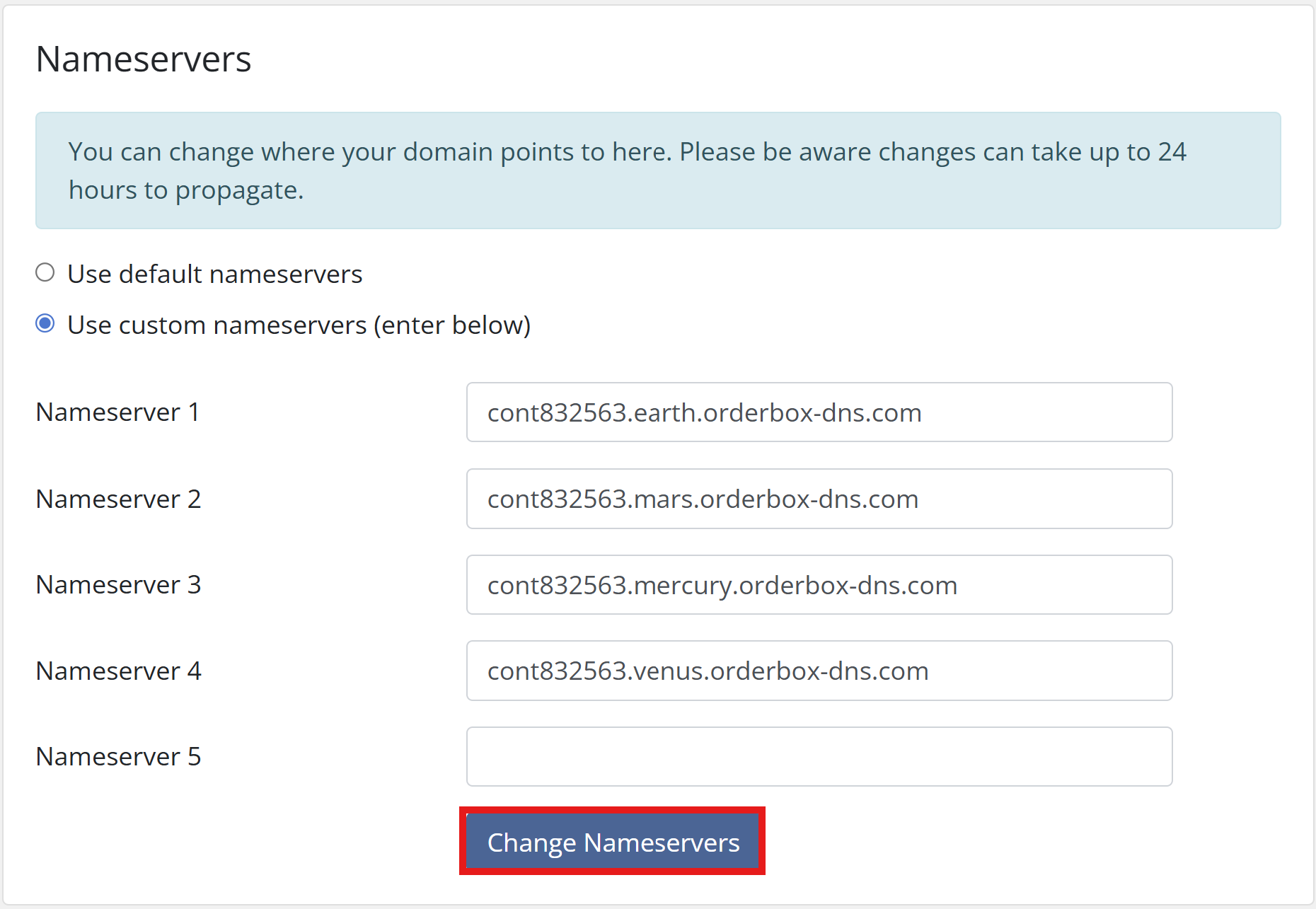 In the same manage menu, select Nameservers. Ensure your domain uses the following DNS nameservers in the screenshot below, which are for non-hosting related services.