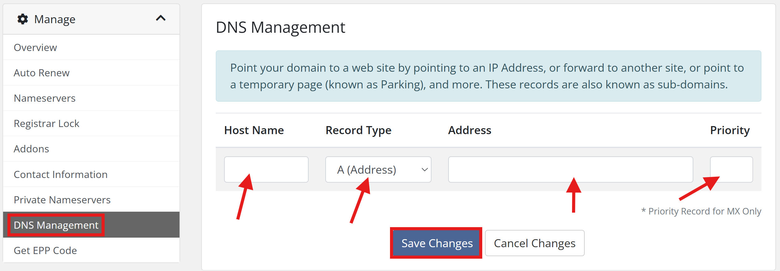 Once your DNS Management is active and nameservers are set, go to Domains, select the domain name (click the section, not the URL), then click DNS Management to start adding, modifying, or deleting records.