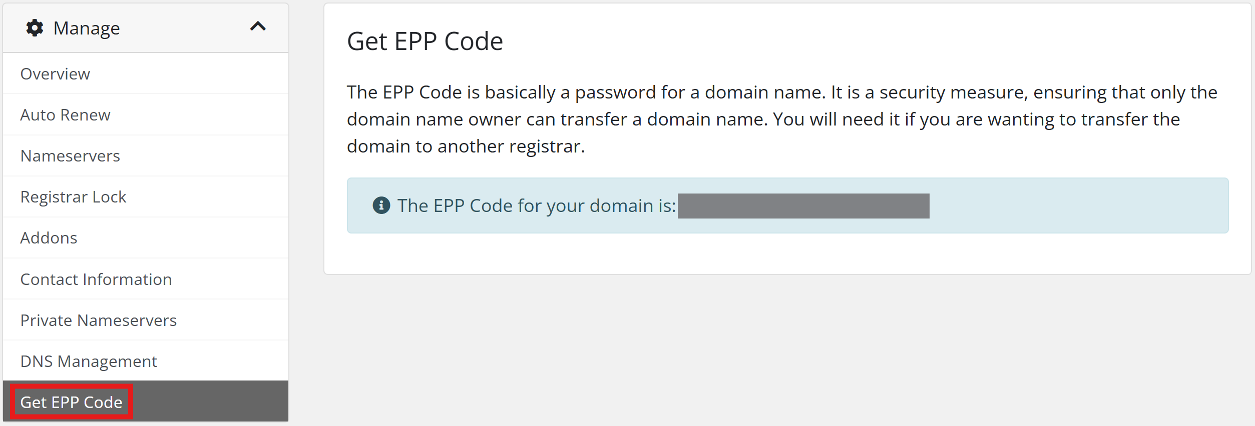4) Click Get EPP Code. The code will be displayed—copy it and store it securely. You will need it at the new registrar in order to transfer the domain.