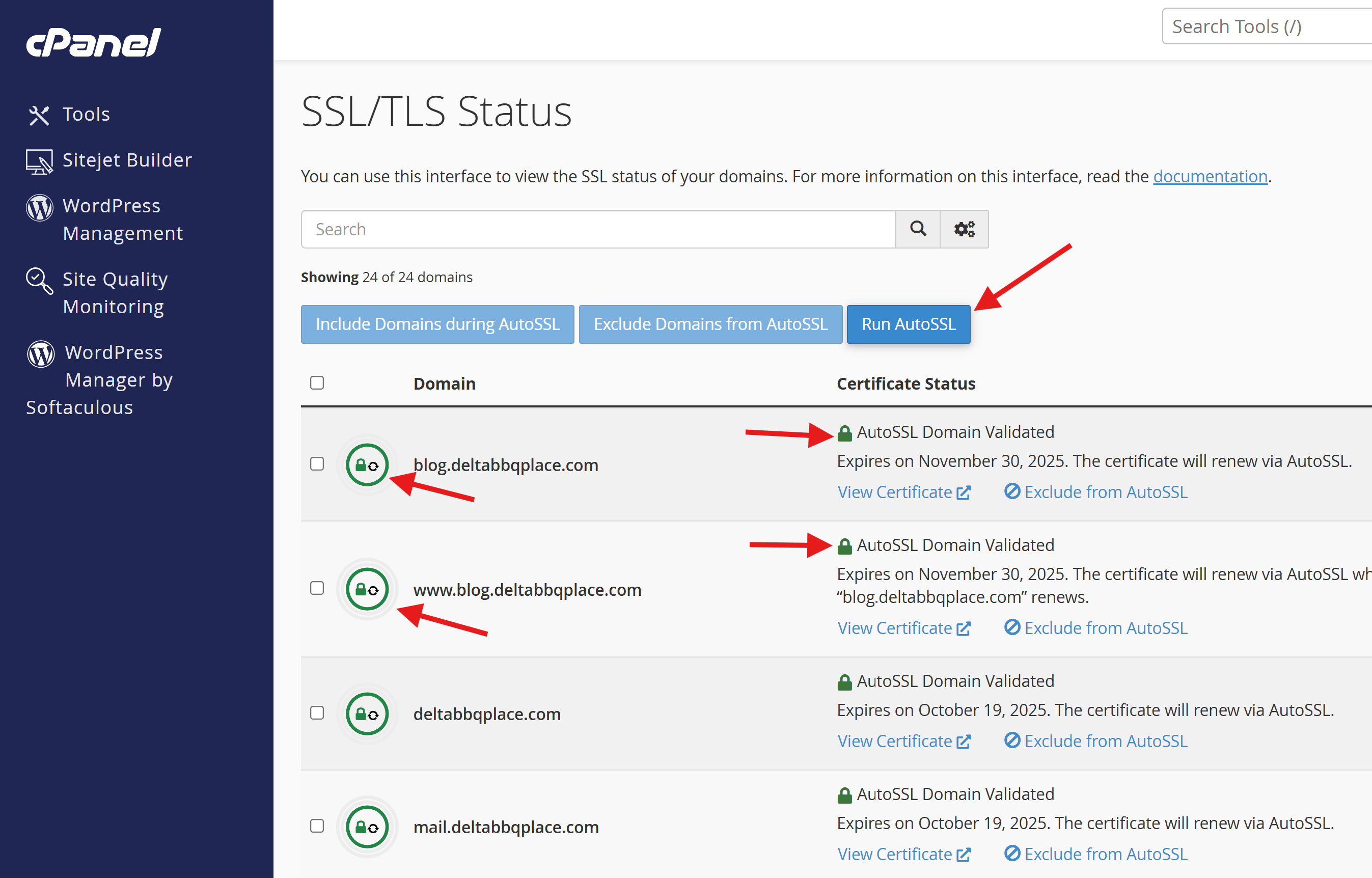 STEP 8: Click on Run AutoSSL. The task can take about 10-30 minutes to complete. The padlock icons will be red at first. Once the process is complete, everything will look similar to the image below.