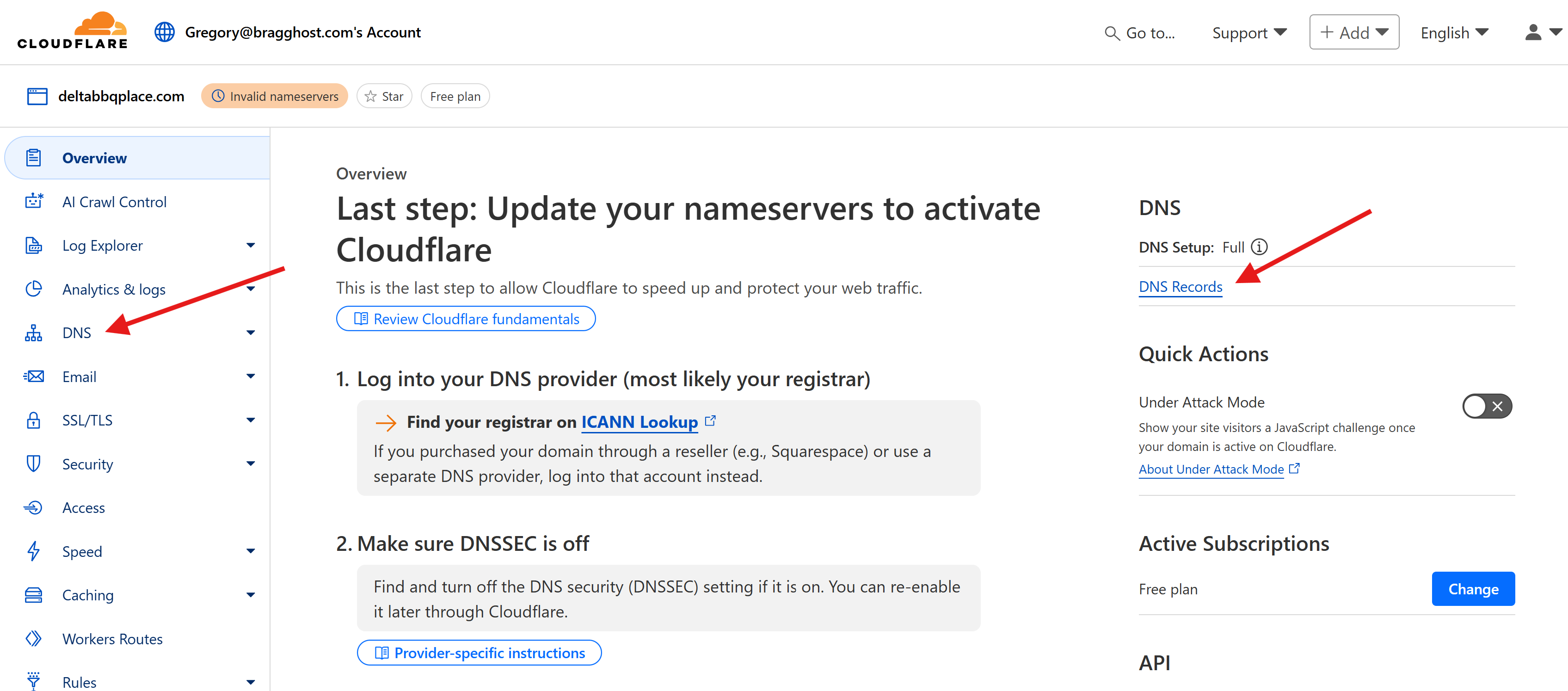 If your domain is using Cloudflare nameservers and you want to make changes to your DNS records (like updating an A, CNAME, or TXT record), you'll need to do this via the Cloudflare dashboard. Bragghost’s DNS tools won’t affect your domain in this case. Here is how you can quickly update those records at