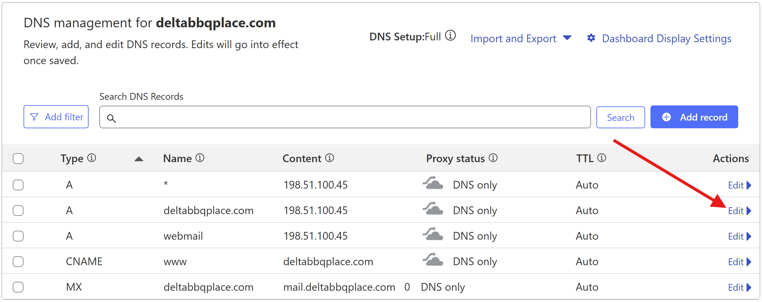 STEP 4: Find the record you want to update (for example, the A record). Click Edit next to that record.