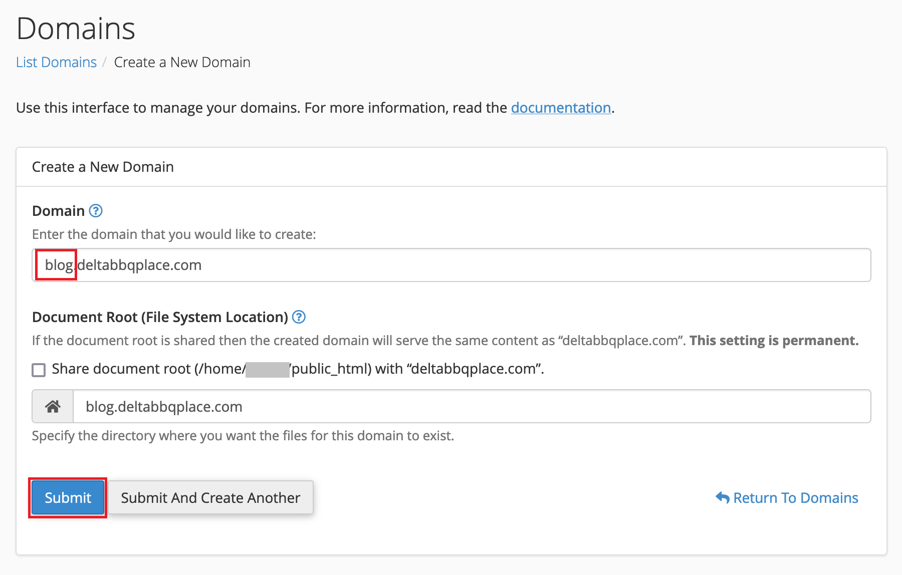 4) On the Domains page, enter the complete subdomain and root domain (ie. subdomain.yourwebsite.com) and define the Document Root folder. Under "Document Root (File System Location)," make sure the box next to "share document root" is unchecked. For this example, we’re going to call ours blog.deltabbqplace.com. After this is done, click Submit.