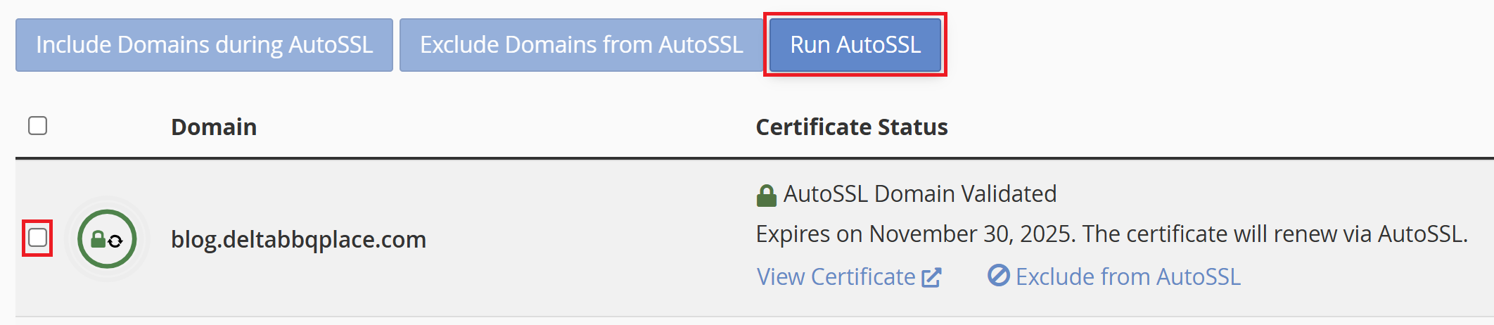 - Check the box next to the red beside the subdomain (as noted in the screenshot below).